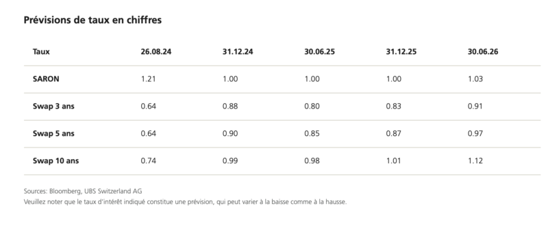 Bien que les perspectives économiques se soient assombries, notre scénario principal ne prévoit pas de récession aux États-Unis ni de stagnation prolongée en Europe. Nous pensons que la BNS procédera à une dernière réduction de son taux directeur de 0,25 point de pourcentage en septembre, pour l'amener à 1,00 %, avant de le stabiliser à ce niveau dans les trimestres à venir. Les rendements des obligations d'État suisses devraient alors repartir légèrement à la hausse, tout comme les taux hypothécaires à plus long terme. En revanche, les taux hypothécaires liés au SARON devraient bénéficier de la baisse des taux directeurs de la BNS.
